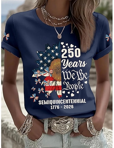 Mulheres Camiseta Imprimir Gráfico Bandeira Letra Vintage à moda Clássico Manga Curta Gola Redonda Decote Redondo Tops regulares Casual Diário Azul Vermelho Verão Primavera