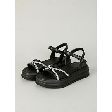 Sandálias plataforma pretas femininas com tiras adornadas com strass - sandálias casuais com fivela ajustável no tornozelo, ideais para viagens, parques e uso diário.