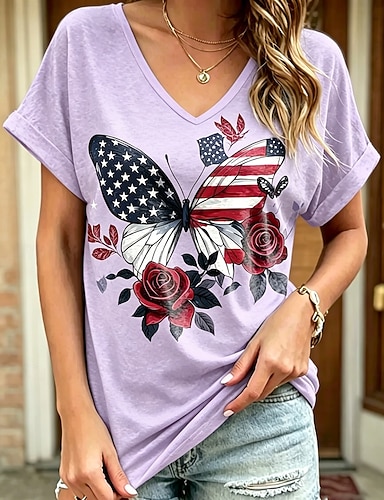 Dia da Independência Camiseta Patriótica Feminina Impressão Gráfica Bandeira Vintage Estilosa Clássica Manga Curta Decote em V Tops Regulares Dia a Dia Azul Preto Vermelho Verde Verão Primavera