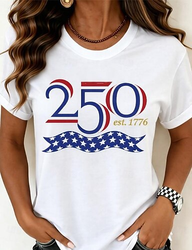 Dia da Independência Camiseta Patriótica Feminina Impressão Gráfica da Bandeira Vintage Estilosa Clássica Manga Curta Decote Redondo Camisetas Regulares Diário Fim de Semana Impressão Preto Branco