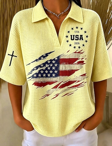 Dia da Independência Americana Mulheres Camisas Polo Waffle Gráfico Bandeira Vintage à moda Clássico Manga Curta Colarinho polo Tops regulares Casual Diário Branco Vermelho Verão Primavera