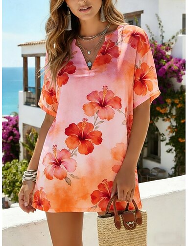 Mulheres Minivestido Vestido casual Vestido T shirt Vestido de verão Elegante Férias Vintage Ombro frio Normal Floral Gráfico Manga Curta Decote V Rosa Azul Roxo Verde Verão Primavera