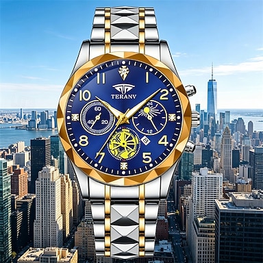 Relógio masculino de luxo - relógio de pulso executivo bicolor em aço inoxidável dourado com fase da lua &Relógio de quartzo analógico à prova d'água com mostrador azul e data, presente elegante para