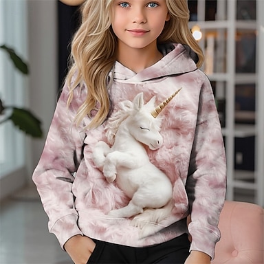Para Meninas 3D Unicórnio Moletom Manga Longa Outono Inverno Moda Adorável Básico Infantil 4-12 anos Com Capuz Ao ar livre Casual Diário Normal