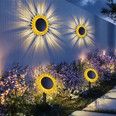 Luminária solar de girassol para instalação no solo ou na parede, ideal para pátio, gramado e jardim. 1 conjunto.