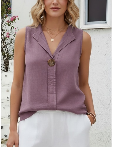Mulheres Blusa Linho de algodão sintético Botões Tecido Casual Sem Manga Decote V Tops regulares Diário Feriado Para Noite Azul Vinho Roxo Verde Verão Primavera