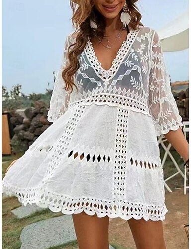 Capa para Maiô Feminino Vestido Renda Patchwork Férias Praia Vestuário Cor Sólida V Decote Sem Mangas Longas