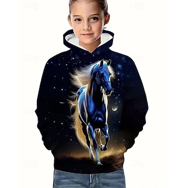 Para Meninas 3D Gráfico Cavalo Moletom Manga Longa Primavera Outono Moda Roupa de rua Infantil 4-12 anos Com Capuz Ao ar livre Casual Diário Normal