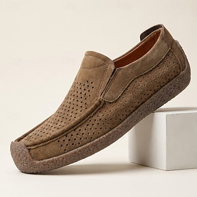 Mocassins masculinos marrons perfurados, estilo slip-on, leves, respiráveis e confortáveis para caminhada. Calçados macios e elegantes para uso diário, viagens, dirigir e lazer no verão.
