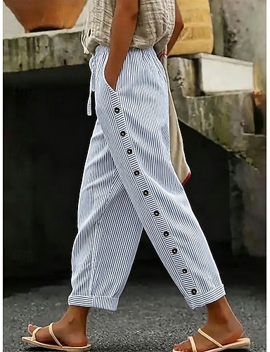 Mulheres Linho de algodão sintético Calças Calça casual Calça verão Férias Moda Básico Mimolet Cintura Média Floral Gráfico Listrado Bolsos laterais Listas Imprimir Conforto Confortável Sem