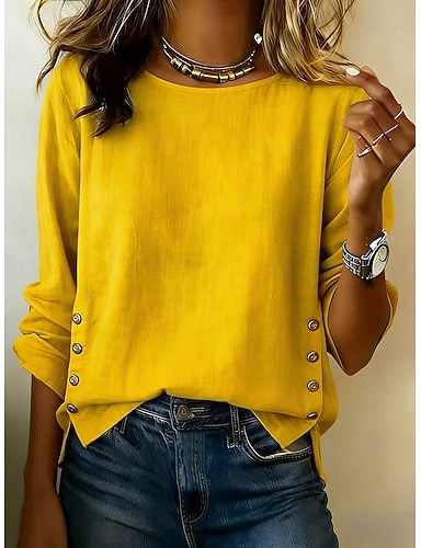 Mulheres Blusa Botões Côr Sólida Diário à moda Básico Manga Longa Gola Redonda Tops regulares Diário Azul Preto Amarelo Vermelho Primavera Outono