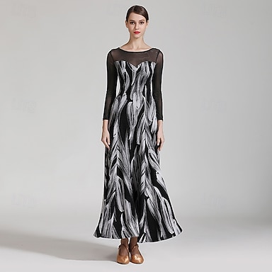 Vestido de dança de salão feminino preto e branco com estampa de penas, detalhes em tule e mangas compridas, estilo valsa, moderno.