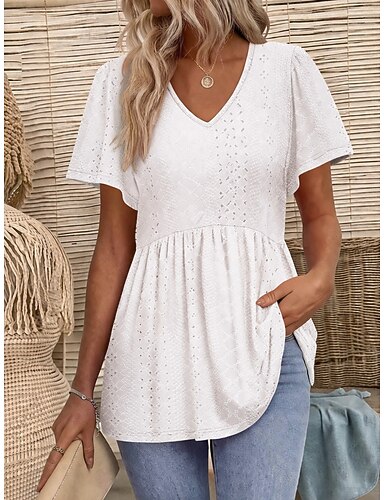 Mulheres Blusa Textura Topo de ilhó Camiseta Pointelle Blusa Vazado Tecido Vintage à moda Manga Curta Decote V Tops regulares Casual Diário Praia Preto Branco Rosa Verde Azul Claro Verão Primavera