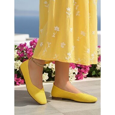 Sapatos femininos amarelos de malha com ajuste largo – mocassins respiráveis, leves e confortáveis, sapatos casuais macios e flexíveis para viagens. &uso diário