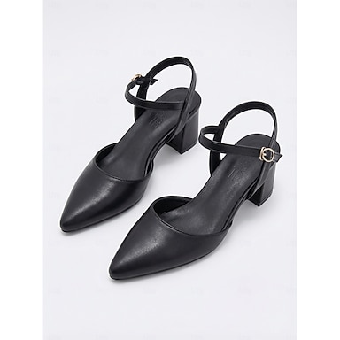 Sapato feminino profissional preto de bico fino com tira no calcanhar - elegante sapato de salto bloco com tira ajustável no tornozelo para reuniões de negócios e ocasiões formais de trabalho.