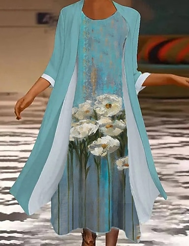 Mulheres Conjuntos de saia Manga 3/4 Sino Gola Redonda Floral Imprimir Moda Roupa de rua Roupa Diária Encontro Azul Roxo Azul Claro Primavera Normal
