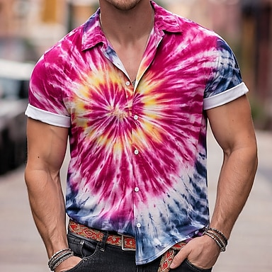 Homens Hippie Impressão Tie Dye Camisa Social camisa de botão Manga Curta Moda Casual Streetwear Férias Verão Primavera Aberto para a Lateral Impressão 3D camisas de colarinho Rosa Laranja Verde