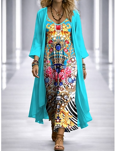 Mulheres conjunto de vestido Vestido A Line Elegante Férias Gráfico Geometria Multi Camadas Imprimir Vestido Longo Manga 3/4 Decote V Diário Festa Azul Vermelho Roxo Verão Primavera Ajuste Largo