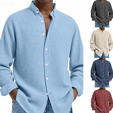 Homens Camisa Social Camisa Waffle Camisa casual camisa de botão Preto Branco Vinho Azul Marinha Azul Manga Longa Tecido Lapela Casual Diário Roupa Moda Roupa de rua