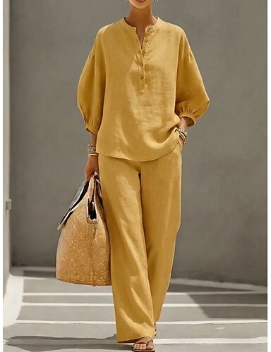 Mulheres Conjuntos de calças Manga 3/4 Gola Redonda Côr Sólida Moda Roupa de rua Casual Diário Ao ar livre Azul Amarelo Bege Primavera Verão Ajuste Largo