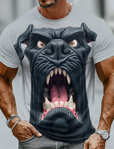 Camiseta masculina streetwear com estampa realista de cabeça de bulldog preto rugindo e dentes afiados, gola redonda, manga curta, cinza, ideal para academia, treino e uso casual. Presente perfeito
