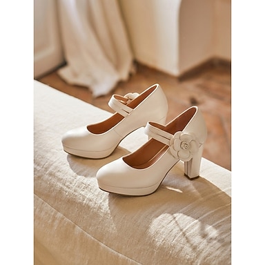 Mulheres Diário Flor Plataforma Salto de bloco Ponta Redonda Elegante Couro Sintético Velcro Preto Branco Rosa claro