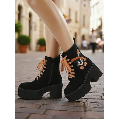 Botas femininas de plataforma com cadarço e bordado de gato para Halloween – botins de salto grosso em camurça preta para festivais de outono, streetwear e festas à fantasia