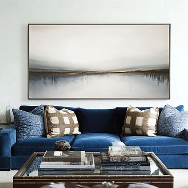 Arte de parede abstrata com céu cinza e nuvens, pintura minimalista de paisagem, pintura acrílica moderna sobre tela, arte de parede grande para quarto ou sala de estar.