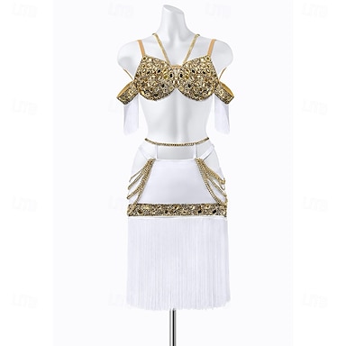 Conjunto de dança latina feminino em branco e dourado com lantejoulas - top com aplicações de miçangas, saia com franjas e detalhes em corrente, mangas ombro a ombro. Ideal para apresentações.