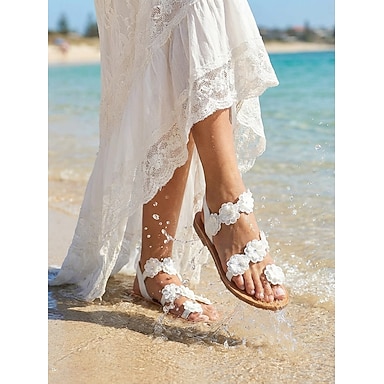 Sandálias rasteiras brancas femininas com estampa floral, elegantes sapatos de noiva com detalhes em renda, sandálias para casamento na praia.
