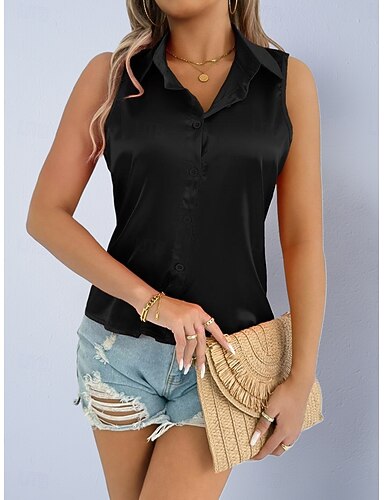 Mulheres Camisa Social Blusa de cetim Blusa camisa sem manga Botões Tecido à moda Clássico Moderno Sem Manga Colarinho de Camisa Tops regulares Diário Feriado Para Noite Preto Branco Roxo Laranja