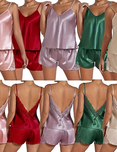 Mulheres Pijamas Loungewear Conjunto de Pijama Ativo Moda Sensual Cor imaculada Renda Frente Única Calção Diário Casa De Cama Sem Manga Correias Champanhe Verde Claro Vermelho Roxo Verde Verão Ajuste