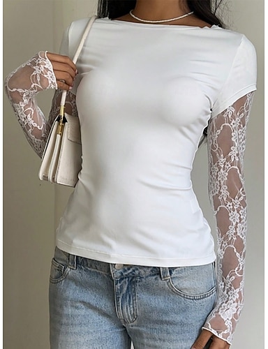 Mulheres Camiseta Top de emenda de renda T-shirt Renda Patchwork Túnica Gráfico Tecido à moda quente Clássico Manga Longa Gola Redonda Decote Redondo Tops regulares Diário Para Noite Final de semana