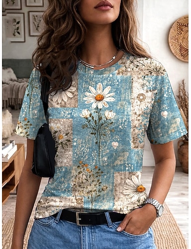 Mulheres Camiseta Imprimir Floral Gráfico Plantas Vintage à moda Casual Manga Curta Gola Redonda Decote Redondo Tops regulares Casual Diário Azul Rosa Roxo Verão Primavera