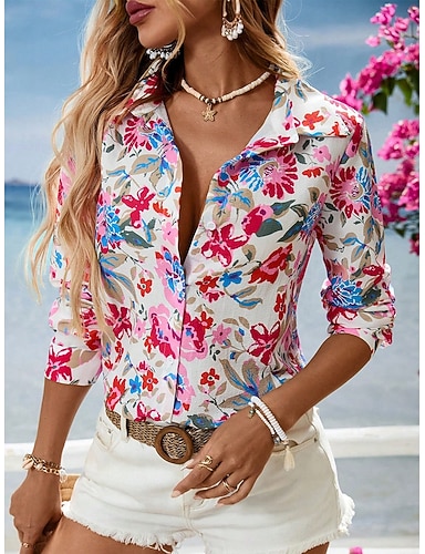 Mulheres Camisa Social Blusa Botões Floral Casual Manga Longa Colarinho de Camisa Tops regulares Diário Feriado Para Noite Azul Amarelo Laranja Rosa cor de Rosa Verão Primavera