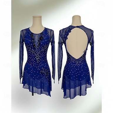 Vestidos para Patinação Artística Mulheres Patinação no Gelo Vestidos Azul marinho Patchwork Sem costas Com Stretch Treino Competição Roupa para Patinação Clássico Cristal / Strass Manga Longa