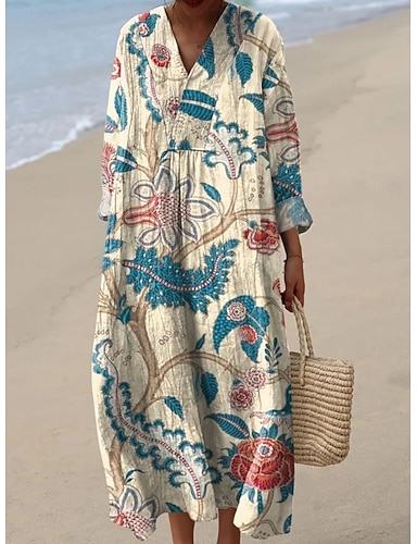 Mulheres Vestido Longo Vestido de turno Casual Diário Para Noite Ajuste Largo Floral Gráfico Manga Longa Decote V Azul Vermelho Bege Verão Primavera