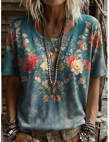 Mulheres Camiseta Imprimir Floral Gráfico Geométrica Vintage à moda Casual Manga Curta Gola Redonda Decote Redondo Tops regulares Casual Diário Azul Rosa Verde Verão Primavera