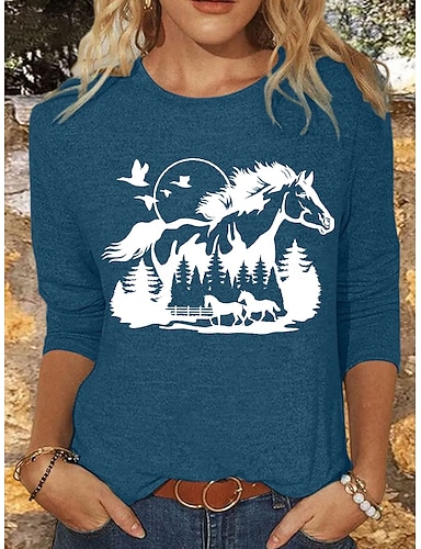 Mulheres Camiseta Imprimir Gráfico Animal Cavalo Vintage à moda Clássico Manga Longa Gola Redonda Decote Redondo Tops regulares Diário Azul Rosa Cáqui Cinzento Primavera Outono Inverno