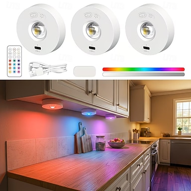 Conjunto de 3 luzes LED recarregáveis para armários, magnéticas, sem fio, com controle remoto RGB, ideais para closets, adegas e iluminação sob armários. Não requerem fiação e são recarregáveis via