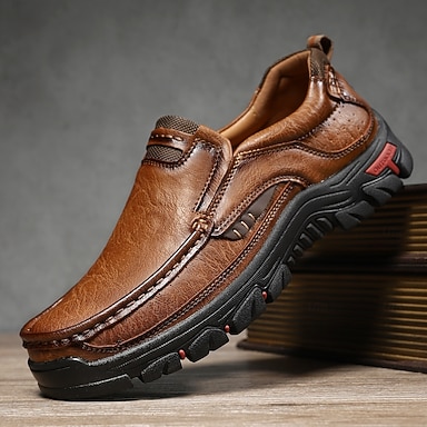Sapatos masculinos slip-on em couro sintético marrom com sola robusta - calçado confortável e estiloso para passeios casuais e atividades ao ar livre.