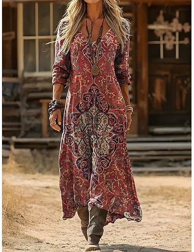 Vestido Maxi Boho Feminino Vestido de Verão Vestido Shift Férias Casuais Praia Saindo Ajuste Regular Gráfico Paisley Tribal Manga Longa Gola V Vermelho Laranja Verão Primavera