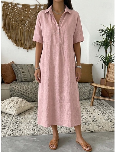 Mulheres Vestido midi Linho de algodão sintético Vestido de turno Vestido casual Básico Moderno Diário Final de semana Ajuste Largo Tecido Meia Manga Pescoço Dividido Azul Preto Rosa Caqui Verão