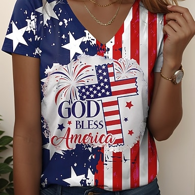 Dia da Independência Americana Mulheres Camiseta Imprimir Gráfico Letra Bandeira americana à moda Clássico Casual Manga Curta Gola Redonda Tops regulares Diário Azul Preto Branco Verde Verão Primavera