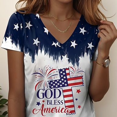 Dia da Independência Americana Mulheres Camiseta Imprimir Gráfico Letra Bandeira americana à moda Clássico Casual Manga Curta Gola Redonda Tops regulares Diário Branco Verde Tropa Azul Marinha Verão