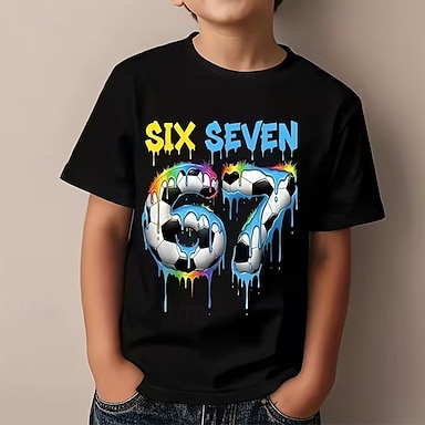 Camiseta infantil masculina 100% algodão com estampa divertida de futebol e gíria número 67, gola redonda, manga curta, casual, para uso diário, esportes ao ar livre, moda streetwear e verão.