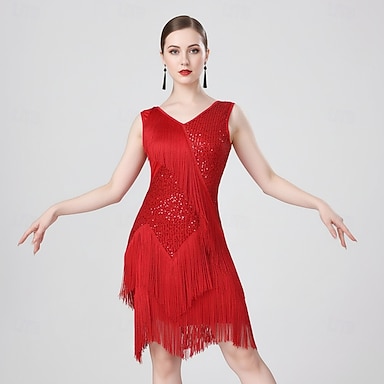 Vestido de dança feminino vermelho sem mangas com franjas de lantejoulas
