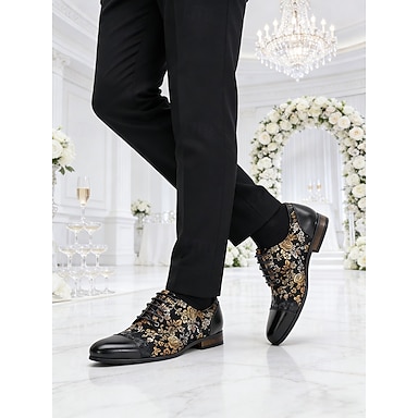 Sapatos de casamento masculinos elegantes em couro preto com estampa floral dourada, calçado de alta qualidade para casamentos e celebrações formais.