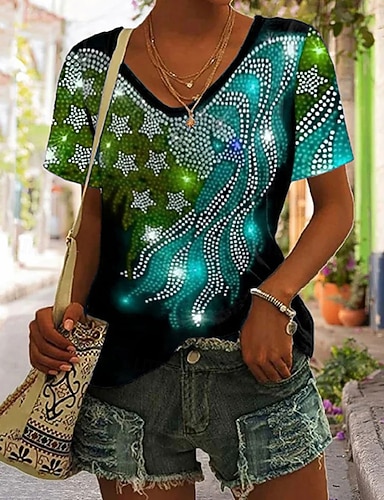 Mulheres Camiseta Imprimir Gráfico Spot de Luz Multi-Colorida Boêmia Vintage Casual Manga Curta Decote V Tops regulares Diário Preto Branco Amarelo Rosa Verde Tropa Verão Primavera