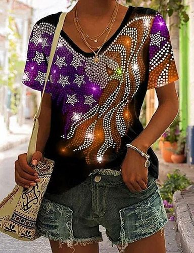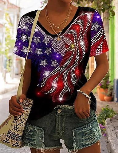 Dia da Independência Camiseta Patriótica Feminina Impressão Gráfica Bandeira Estilosa Clássica Casual Manga Curta Decote em V Tops Regulares Dia a Dia Azul Vermelho Vermelho Azul Verão Primavera